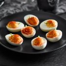 Transfer the egg yolk mixture to a piping bag fitted with your desired tip. Pipe the yolk mixture into the egg white halves so that the filling is slightly domed over the edge.