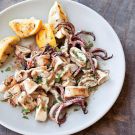 Toss the squid with the dressing and serve hot or at room temperature, with the lemon wedges alongside. Serves 4 to 6.