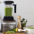 Transfer the contents of the sauté pan to the thermal control jar of a KitchenAid Pro Line blender. Add the whole mint leaves to the blender. Secure the lid, set the blender to the “soup” setting and blend until the machine turns itself off. Season the soup with salt and pepper.
