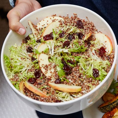 In a large bowl, combine the quinoa, apples, cherries and then the frisée. Drizzle with a little more dressing and toss to coat. Adjust the seasoning with salt and serve. Serves 8.