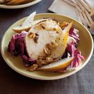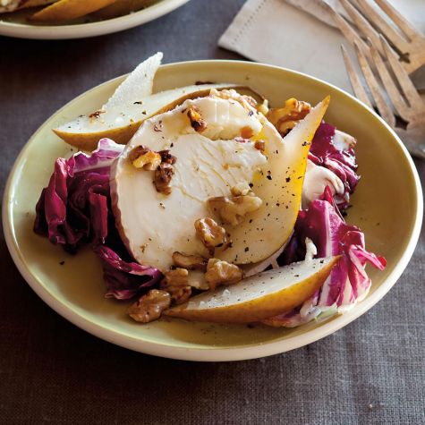 Pairing brilliant red radicchio with golden-, green-, or red-skinned pears results in a festive salad that can brighten up any gloomy winter day. Goat cheese and walnuts accompany the radicchio here, but a mild blue and almonds or pistachios can be used in their place.