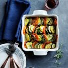 Perfumed with the region’s olive oil, wild thyme and garlic, ratatouille is the signature summer dish of Provence, where it is prepared when gardens are full of peppers, eggplant and zucchini. Here we layer the vegetables in a pretty baking dish or gratin for a ratatouille that's all dressed up for company.