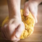 To knead the dough, on your work surface, drive the heel of your dominant hand into the dough. Push down and release, and then use your other hand to pick up and rotate the dough on itself 45 degrees. Drive the heel of your hand back in the dough, rotate and repeat for 10 to 15 minutes. When the dough is ready, it will stop changing appearance and texture. The dough will be firm but bouncy to the touch and have a smooth, silky surface, almost like Play-Doh. Tightly wrap the dough in plastic wrap before proceeding as directed with your recipe. Makes about 20 oz. (625 g) of dough.