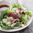In a large bowl, toss the noodles with half of the dressing. Separate the head of lettuce into leaves. To assemble the salad, arrange the lettuce leaves, cucumber, and half of the cilantro and basil on a platter or individual plates. Top with the noodles and steak slices. Serve the remaining dressing on the side or pour it over the meat. Scatter the remaining cilantro and basil leaves, the minced chili and the sesame seeds on top. Serve at room temperature. Serves 4.