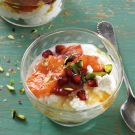 Divide the cheese equally among 4 dessert bowls or short glasses. Divide the oranges among the bowls, arranging them on top of the cheese. Sprinkle evenly with the pistachios and pomegranates, then drizzle each serving with 1 Tbs. honey. Serve immediately. Serves 4.