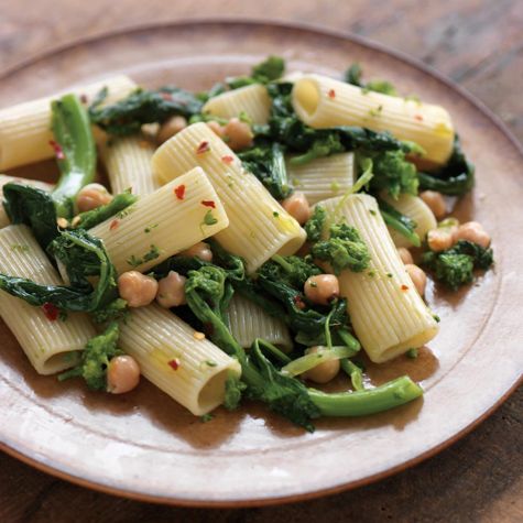 While the broccoli rabe is cooking, in a fry pan large enough to accommodate the pasta later, warm the olive oil over medium heat. Add the garlic and chilies, reduce the heat to medium-low and sauté gently until the garlic colors, about 5 minutes. Drain the greens and add them, still dripping wet, to the fry pan. Increase the heat to medium, stir well and sauté for 2 minutes. Add the chickpeas, reduce the heat to medium-low, cover and cook gently, stirring occasionally, until the chickpeas are heated through and the greens are tender, about 5 minutes. Season with sea salt. Remove from the heat and cover to keep warm.