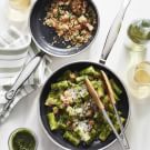 We put a fresh twist on the classic pesto, swapping in kale and parsley for the basil and adding a spoonful of miso, which lends a little salty-sweetness. Just whirl the ingredients together in a food processor, then toss with cooked rigatoni and top with crunchy homemade croutons. Be sure to use white, or shiro, miso for this recipe—it’s milder in flavor and less salty than yellow or red miso.