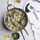 Perfect for a dinner for two, this hearty risotto packed with fresh greens and pancetta is just the thing for a cold winter night. Use whatever greens look best at your market, such as kale, chard or spinach.