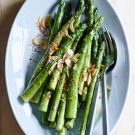 Place the asparagus on a baking sheet and drizzle with the garlic-infused olive oil. Season with salt and pepper, toss to coat and spread the asparagus in a single layer. Transfer to the oven and roast until the asparagus is crisp-tender, about 10 minutes. Transfer to a serving platter and sprinkle with the orange zest and crispy garlic. Serve warm or at room temperature. Serves 4.