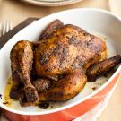 Remove the chicken from the oven and insert an instant-read thermometer into the thickest part of the thigh, away from the bone; it should register about 165°F. Transfer the chicken to a carving board and let rest for at least 10 minutes before carving. Serves 4.