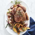 Place the chicken on the platter with the vegetables. Garnish with lemon wedges and thyme and rosemary sprigs. Serve immediately. Serves 4.