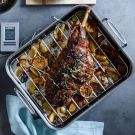 Coated with an herb paste and roasted on the bone, this leg of lamb emerges exceptionally flavorful and is large enough feed a crowd. The juices from the lamb flavor the potatoes, which stay moist beneath the lamb but form a crisp crust elsewhere.