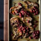 Place the chops on a nonstick baking sheet and roast for 5 minutes. Remove the baking sheet from the oven, turn the chops over, and place the grape mixture on the chops, dividing it evenly. Continue roasting until the chops are done to your liking and the grapes are starting to burst, about 12 minutes more. Let rest for 5 minutes, then serve the chops and grapes drizzled with the pan juices. Serves 6.