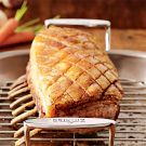 Set a roasting rack in the pan. Place the pork, fat side up, on the rack. Roast until an instant-read thermometer inserted into the thickest part of the meat, away from the bone, registers 140ºF, about 1 1/2 hours. Transfer the pork to a carving board, cover loosely with aluminum foil and let rest for 20 minutes before carving.