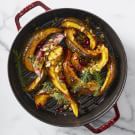 Pour the butter over the squash, using your hands to rub it all over the wedges. Cover the baking sheet with aluminum foil (or cover with the lid, if using a Dutch oven) and roast for 30 minutes. Remove the foil and continue roasting until the squash is tender and caramelized, about 30 minutes more.