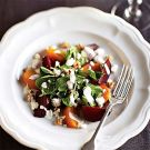 Golden and red beets are combined with watercress, creamy goat cheese and crunchy walnuts to create a colorful winter salad. Before you roast the beets, cut off the greens and reserve them for another use.