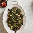 Transfer the broccoli to a serving platter and season with more salt and pepper, if desired. Top with the pine nuts and red pepper flakes and sprinkle the shaved Parmesan on top. Serve immediately. Serves 4 to 6.