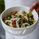 Just when you think you’ve tried every variation on the raw kale salad imaginable, along comes this amazing recipe from New York City’s Haven’s Kitchen. Hot roasted brussels sprouts are tossed with the kale until wilted, then topped with Parmesan cheese and crunchy pecans. If desired, you can coarsely chop the pecan halves instead of leaving them whole.