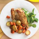 Meanwhile, add the parsley to the potatoes and carrots and stir to combine. Remove the foil from the chicken, carve into serving pieces and arrange on a warmed platter. Serve immediately. Serves 4, with leftovers.
