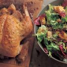 In a large bowl, combine the salad greens, toasted bread cubes, toasted walnuts and dried cranberries. Add the warm vinaigrette and toss to coat. Divide the salad among warmed dinner plates. Cut the chicken into quarters and place a chicken quarter on top of each salad. Serve immediately. Serves 4.