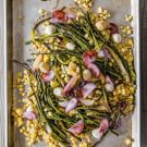 In a bowl, toss together the onions and 2 Tbs. of the olive oil, and season with salt and pepper. Place the onions in a single layer on one end of the prepared baking sheet. Brush the corn with 1 Tbs. of the olive oil and season with salt and pepper. Place on the pan in a single layer, leaving room for the asparagus, and roast for 15 minutes.