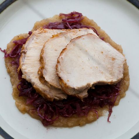 Roasted Pork Loin with Braised Red Cabbage and Smoked Apple Puree