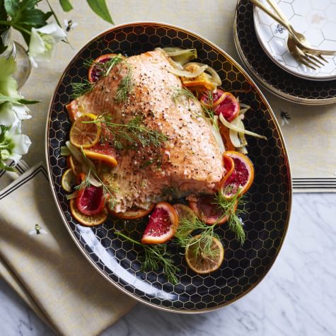 An impressive centerpiece for a springtime meal, this recipe features a large fillet of salmon slow-roasted on a bed of colorful citrus fruits and fresh fennel. The fruit becomes deliciously caramelized, providing a nice contrast to the rich fish, while the fennel lends subtle notes of anise.