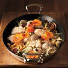 In a large oval roasting pan over medium-high heat, warm 3 Tbs. of the olive oil. Add the fennel and garlic and cook, stirring occasionally, until softened, about 5 minutes. Add the wine and boil for 1 minute. Add the orange juice and peel and simmer for 2 minutes. Season with salt and pepper. Remove from the heat.