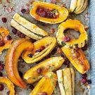 Oil a baking sheet. Trim the ends from each squash and cut into slices or quarters. Scrape out the seeds, reserving some for roasting. Season the slices generously with salt and pepper and arrange on the prepared sheet. Roast for 10 minutes.