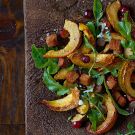 In a large bowl, combine the gingerbread croutons, arugula, lardons and pickled ramps. In a small bowl, whisk the pumpkin and pear butter and the 3 Tbs. olive oil. Add to the salad and toss with your hands to ensure the croutons and arugula are well coated, adding more olive oil, salt and pepper as needed. Divide among individual plates and top with the squash. Serve immediately. Serves 6 to 8.