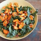 In a large bowl, stir together the lime juice, maple syrup and the remaining 1/2 Tbs. olive oil. Add the hot roasted sweet potatoes, the pecans, green onions and kale. Stir well and season with salt and pepper. Serve immediately, or let cool to room temperature and stir again before serving. Serves 4 to 6.