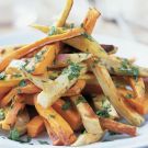 Of the many varieties of sweet potatoes, the dark orange-fleshed tubers (often labeled “yams” in the United States) are especially popular and are a healthful choice because they are high in vitamins A and C. You can also use a combination of varieties. In this simple recipe, sweet potato wedges are lightly seasoned with ground cumin before roasting and then dusted with chopped cilantro when served.