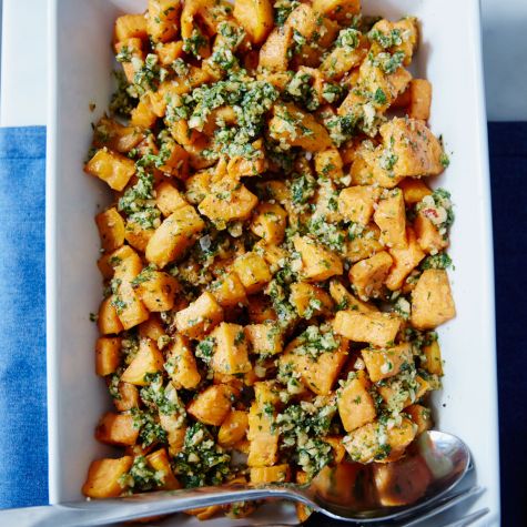 An Italian-inspired gremolata made with toasted hazelnuts lends a bright, refreshing note to roasted sweet potatoes. There are several options for cooking the potatoes, as directed below. If you roast them on a baking sheet, be sure to line it with parchment paper, which creates a moisture-resistant nonstick surface that helps vegetables to brown evenly. It also speeds cleanup because there’s no need to scrub the pan.