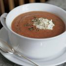 Using a stick blender or blender, puree the soup and season with salt and pepper. Divide the soup among 6 warmed soup bowls and top each with a dollop of the cheese mixture. Serves 6.