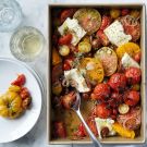 Originating in Cyprus, halloumi cheese holds its shape well during cooking, making it the perfect choice for roasting alongside vine-ripened tomatoes. Serve this warm appetizer at the height of summer with crusty bread for sopping up the delicious juices, or serve as a side with grilled or roasted meats.