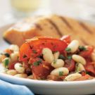 This vegetarian dish is a good source of protein and an excellent source of dietary fiber, vitamin C and many phytochemicals. The creamy texture of the cannellini beans, the mild acidity of the roasted tomatoes and the saltiness of the capers come together in a combination that mates well with grilled fish, or with green vegetables as part of a vegetarian meal.