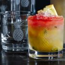 Strain into a double old-fashioned glass filled with crushed ice. Spoon the grenadine on top, garnish with the pineapple wedge and serve immediately. Makes 1 drink.