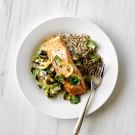 If you’re not a fan of quinoa yet, this hearty dish might make you a convert. Toasting the quinoa gives the whole grain a pleasant nuttiness that pairs well with the salmon and roasted Brussels sprouts tossed in lemon-tahini sauce. This dish has only five main ingredients and comes together quickly for the perfect weeknight meal.