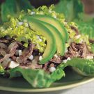 Make a bed of the whole romaine leaves on a platter. Mound the beef mixture on the lettuce and garnish with the avocado slices, shredded lettuce and finely chopped onion. Serve at room temperature. Serves 6.