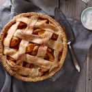 To create the lattice, lay 5 strips of dough spaced evenly apart on top of the pie filling. Fold back every other strip halfway and lay down a strip perpendicular across the unfolded strips. Repeat to place 5 strips of dough evenly across the top, folding back the alternate strips each time. Pinch the lattice strips onto the dough on the rim of the pie dish to make sure they bake together. Brush the lattice crust with the egg wash and sprinkle with the granulated sugar.