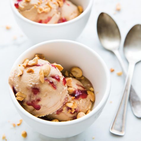 Savory and sweet collide in this adult variation on a childhood classic. Resist overmixing the jam into the ice cream. You want large streaks of fruity sweetness to balance the salty peanut flavor. Top with chopped peanuts for extra crunch.