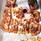 Spread 1/2 cup of the crushed tomatoes evenly over the dough, leaving a 1/2-inch border. Top evenly with one-third each of the mozzarella and salumi. Carefully slide the pizza onto the preheated pizza stone. Bake until the crust is browned and the cheese is melted, 15 to 18 minutes. Using the pizza peel, transfer the pizza to a cutting board and sprinkle with 1 1/2 Tbs. of the basil. Cut into slices and serve immediately. Repeat with the remaining dough and toppings to make 2 more pizzas. Makes 3 pizzas; serves 12.