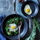 A healthy, hearty breakfast perfect for cold mornings, sautéed eggs and kale are equally good as a super-quick and nutritious weekday dinner. Feel free to substitute other greens, such as Tuscan kale, chard or mustard greens, if you prefer.