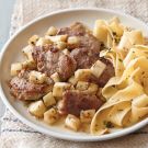 Quick Tips: The noodles could be replaced with rice or bulgur wheat, and carrots, sliced onions, rutabaga or sweet potatoes could stand in for the parsnips. For a slightly sweet version, try dry sherry or Marsala in place of the vermouth.
