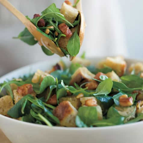 Variation: For an entirely different but equally delicious bread salad, substitute toasted sliced almonds for the pine nuts, watercress for the arugula and orange segments for the pancetta.