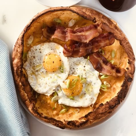 A cross between a pancake and a popover, a Dutch baby makes an impressive centerpiece for a brunch. Though a Dutch baby is often served topped with fresh fruit and a sprinkling of confectioners’ sugar, here we turn it into a savory treat by adding shredded Gruyère cheese to the batter and topping it with fried eggs and bacon. Be sure to have your bacon and eggs cooked and ready to go when the Dutch baby is done, because it will begin to deflate as soon as it comes out of the oven.