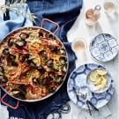Infinitely versatile, paella comes in almost as many versions as there are Spanish cooks. And, although some paella recipes call for chicken, chorizo or both, this one is for real seafood lovers, as it’s chock full of lobster and mussels. (You can substitute large shrimp for the lobster or clams for the mussels, if you prefer.) For a more flavorful broth to add to the rice, you can make a fresh lobster stock from the leftover shells and bodies.