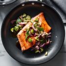 Here, a summertime salsa contributes color, flavor and texture to basic pan-seared salmon. You can make the salsa several hours in advance and refrigerate it until you are ready to serve.
