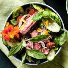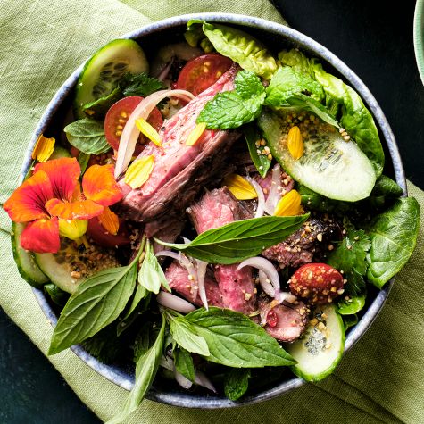 In a large bowl, combine the tomatoes, shallots, cucumber, spinach, cilantro, mint, toasted rice mixture and steak. Add the dressing and toss to combine. Garnish with the edible flowers and serve immediately. Serves 4.