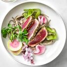 This Japanese-inspired dish makes a striking presentation and tastes as good as it looks. Filled with contrasting flavors and textures, it features crisp pickled daikon radish, peppery watercress, crunchy cucumbers and seared tuna coated with black and white sesame seeds. Everything is served atop a tangle of earthy, nutty-tasting soba noodles tossed with a dressing that includes tamari, wasabi and fresh ginger. You can do much of the work in advance, including pickling the daikon and whisking the dressing together. All that’s left to do is coat the tuna with the sesame seed mixture and give the fish a quick sear, then cook and dress the soba noodles. Serve everything on a platter or plate, as shown in the photo, or in a large bowl if you prefer.